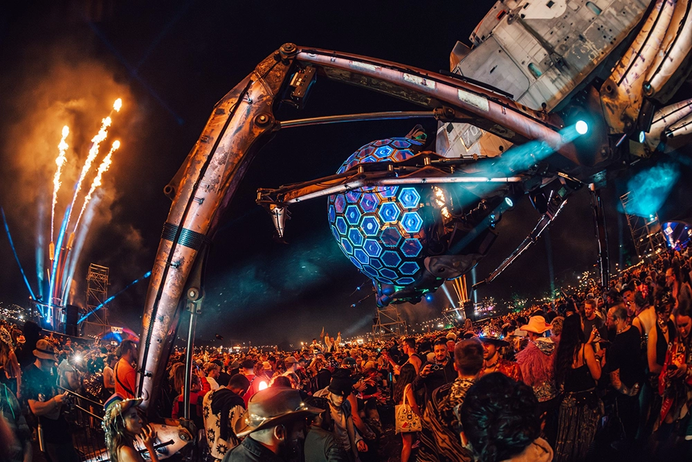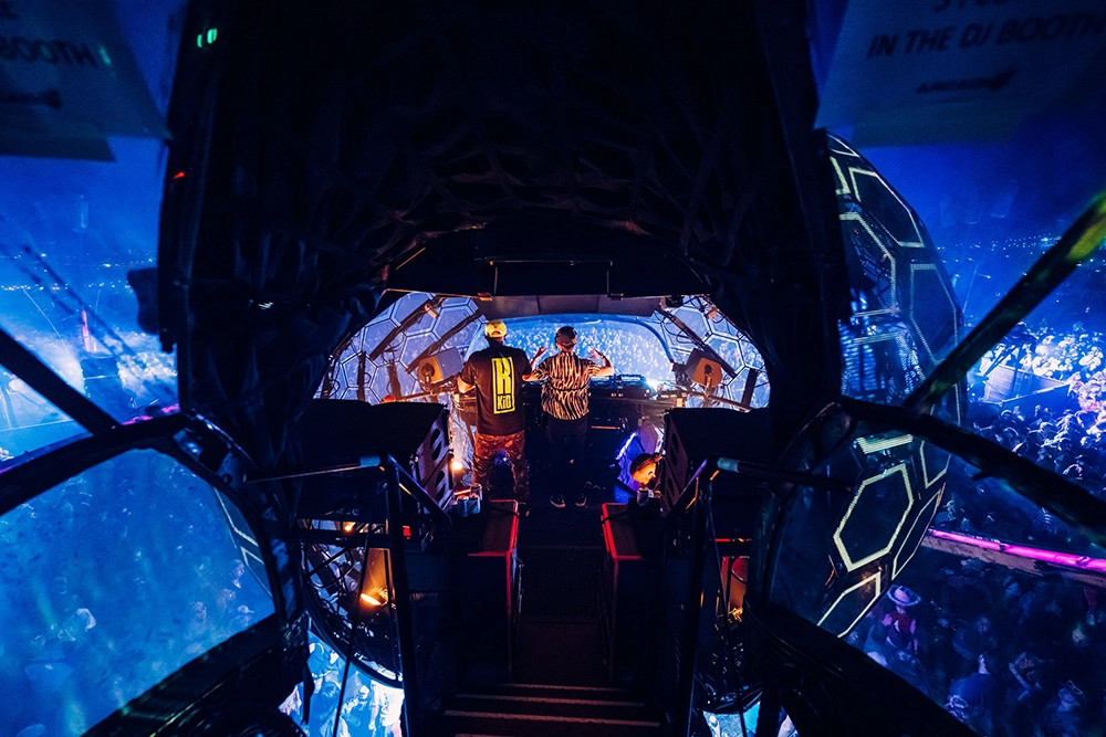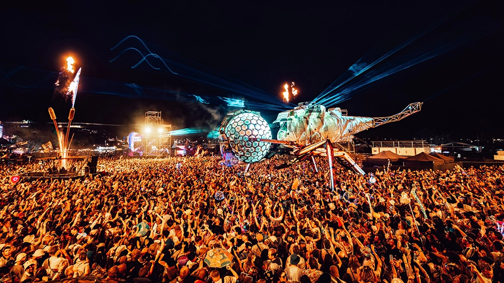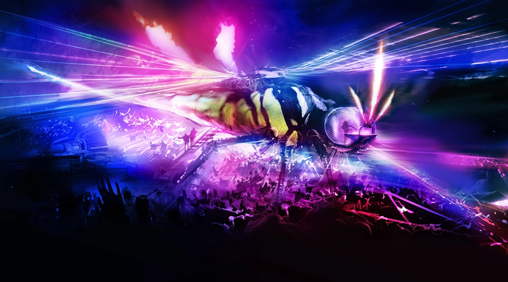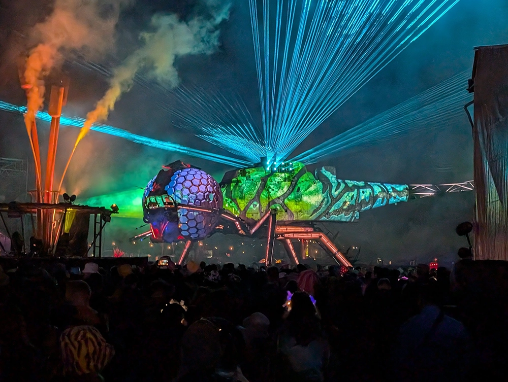 Система плееров бесперебойно подавала контент на восемь проекторов, сдвоенных попарно, сохраняя точный мэппинг и выравнивание в 360‑градусной среде. Она также питала нестандартный прозрачный LED‑экран из более 200 совмещенных шестиугольных панелей, которые образовывали голову стрекозы и сцену для диджея.