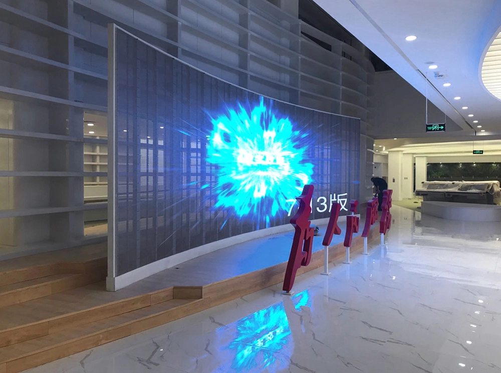 Зонировать помещения с большими стеклянными окнами и частично скрыть обстановку внутри зала от зрителей, находящихся снаружи, помогут светодиодные прозрачные видеостены.