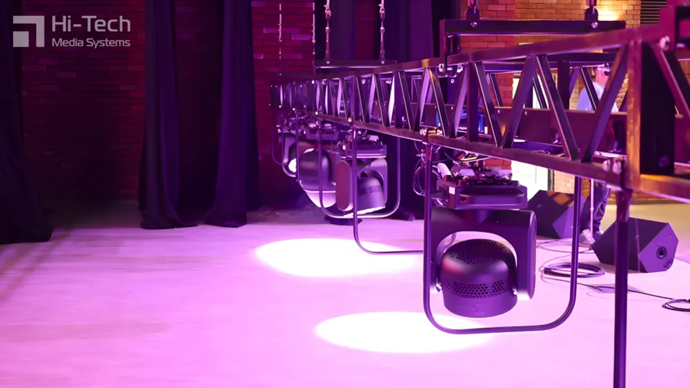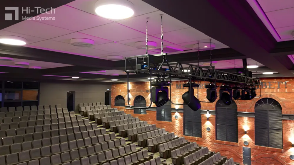 Реализация потребовала решения сложных инженерных задач. Предполагалось, что оборудование будет крепиться к существующим потолочным конструкциям здания. Однако после проведения строительной экспертизы выяснилось, что потолочные балки не рассчитаны на такую нагрузку. В результате было принято решение возвести отдельный алюминиевый каркас сцены, который стал опорой для интеграции верхней механизации, постановочного освещения и одежды сцены.