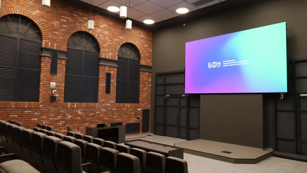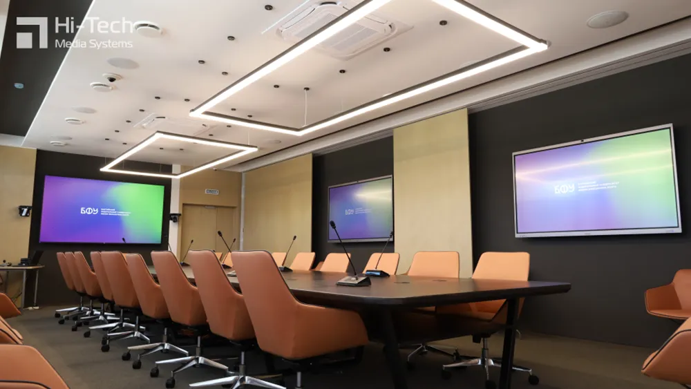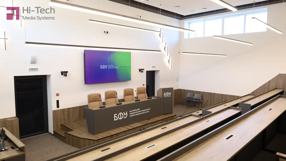 В конференц-зале «Скворечник» и зале ученого совета были внедрены решения для проведения удаленных и гибридных мероприятий. Интеграция включала конференц-оборудование, средства видеоотображения, камеры с автонаведением и функциональную систему управления.